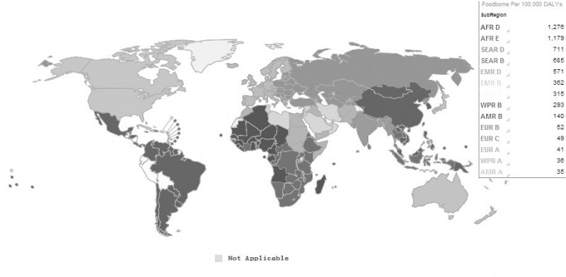 正如環(huán)境污染程度的不同在本質(zhì)上源于發(fā)達(dá)國(guó)家與發(fā)展中國(guó)家權(quán)力和財(cái)富分配不均,食品安全同樣面臨全球區(qū)域間不均衡。由于大部分食品安全問題最終表現(xiàn)為食物中致病因子進(jìn)入人體造成的健康危害,因此由摻假、化學(xué)污染、生物病原體導(dǎo)致的食源性疾?。╢oodborne disease)成為衡量食品安全狀況的重要指標(biāo)。