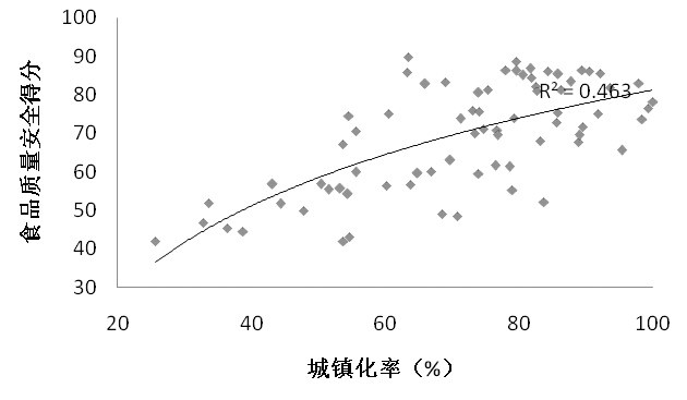 研究表明,食品安全問題與所在國家和地區(qū)城鎮(zhèn)化進程態(tài)勢密不可分,在農(nóng)業(yè)人口數(shù)量下降到總?cè)丝?0%以下時集中爆發(fā)。由于“從農(nóng)田到餐桌”的食品產(chǎn)業(yè)鏈變長,提高了問題發(fā)生概率。同樣基于數(shù)據(jù)可獲得性,研究用對數(shù)回歸分析了2015年全球73個主要國家(地區(qū))城鎮(zhèn)化率與食品質(zhì)量安全得分的相關(guān)性(見圖2),其擬合優(yōu)度(R2)為0.46??梢钥吹剑擎?zhèn)化率超過50%后數(shù)據(jù)離散度明顯提高,風(fēng)險波動性增大;超過80%后開始收斂,即不確定性減弱。例如19世紀(jì)中期美國北方城市化發(fā)展迅速,周邊農(nóng)村鮮奶供應(yīng)跟不上大量涌入城市的人口,不法商人通過催乳、摻假手段生產(chǎn)“兒童衛(wèi)生奶”。最后,終于爆發(fā)1858年紐約“泔水奶”事件,導(dǎo)致5.3萬名嬰兒受感染,1年內(nèi)有近8000名兒童死亡。英國、德國、日本工業(yè)化進程中的食品安全問題同樣經(jīng)歷了類似的過程。