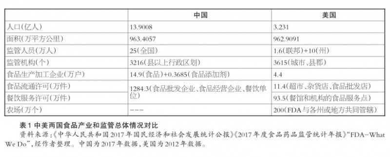 與“大產(chǎn)業(yè)”和廣闊地理區(qū)域形成鮮明對比的是,我國食品安全監(jiān)管體系整體薄弱。通過梳理中美兩國食品產(chǎn)業(yè)和監(jiān)管總體情況(見表1),我們發(fā)現(xiàn)三方面顯著差距。一是我國每萬人口監(jiān)管人員比例約為1.8,美國則高達3.6,監(jiān)管資源基礎(chǔ)不同。二是我國食品經(jīng)營環(huán)節(jié)市場主體超過1280萬戶,美國僅105萬戶,監(jiān)管對象規(guī)模存在差異。三是監(jiān)管機構(gòu)平均承擔(dān)的監(jiān)管任務(wù),我國遠(yuǎn)多于美國。在這種監(jiān)管資源和監(jiān)管能力的硬約束下,靜態(tài)行政許可和“運動式”專項整治成為主要政策手段。由于“重審批、輕監(jiān)管”的監(jiān)管風(fēng)格導(dǎo)致審管脫節(jié),審批往往在現(xiàn)實中異化為政府對企業(yè)的背書和包辦,進而制約日常監(jiān)督檢查有效性。