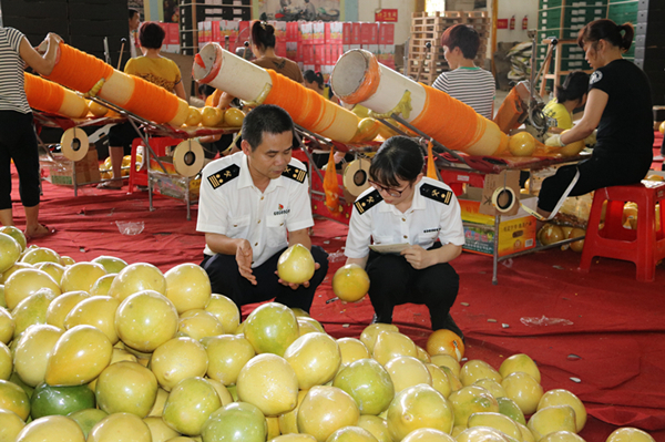 圖為:汕頭海關(guān)隸屬梅州海關(guān)關(guān)員對(duì)出口蜜柚實(shí)施現(xiàn)場監(jiān)管 胡瑞/攝