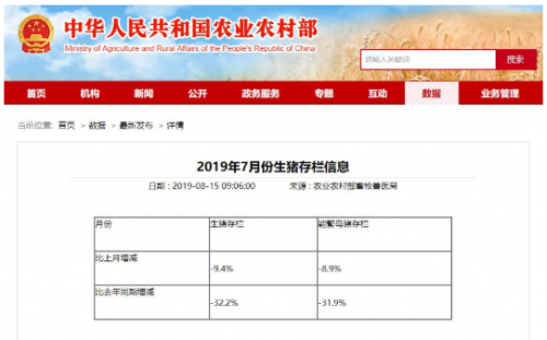 據(jù)農(nóng)業(yè)農(nóng)村部發(fā)布19年7月份生豬存欄信息,與去年同期相比,生豬存欄-32.2%,種豬存欄-31.9%。
