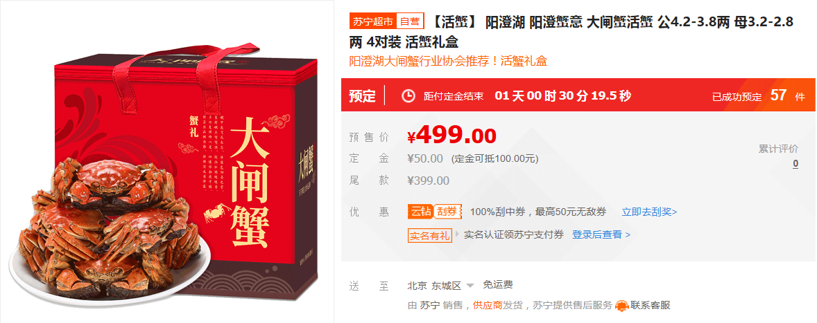 不僅如此,在線上蘇寧還推出了三款定制禮盒,包括預售價528元的今錦上弘悅禮盒B型、預售價528 元的陽澄蟹意活蟹禮盒、預售價358元的今錦上弘悅禮盒A型。數(shù)據(jù)顯示,截至23日上午10點,蘇寧平臺已經(jīng)累計預售包括今錦上、陽澄蟹意等品牌在內(nèi)的累計6400只正宗陽澄湖大閘蟹。在線下,消費者可以直接到家門口的蘇寧小店提貨購買,還可以到蘇鮮生親自品嘗來自陽澄湖的第一簍美味。
