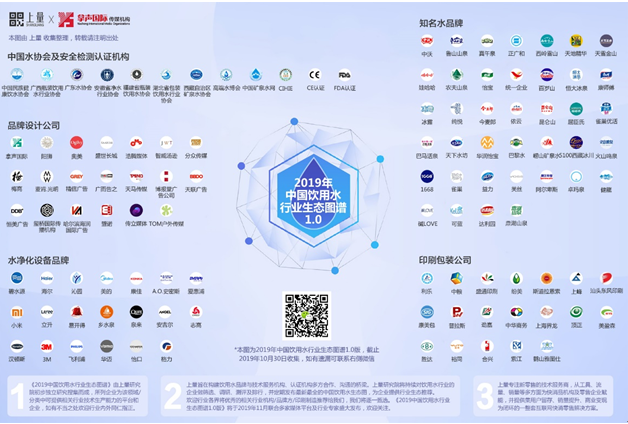 《2019中國飲用水行業(yè)生態(tài)圖譜1.0版》由上量研究院初步獨立研究搜集而成,進(jìn)行了歸類與整合,覆蓋“印刷包裝、安全檢測認(rèn)證/協(xié)會、水凈化設(shè)備、品牌設(shè)計、品牌廠商”六大類別。