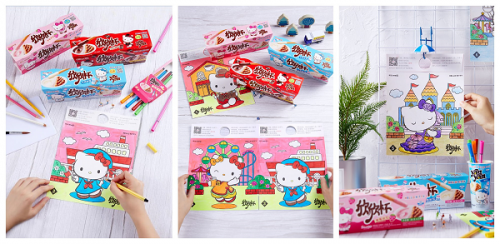 將三杯裝的紙盒拆開,背面就變身為一張Hello Kitty的涂色卡。小朋友可以發(fā)揮創(chuàng)意自由填色。HelloKitty的主題涂色共有6款設(shè)計,收集之后可以拼接在一起。還有一個隱藏技能,利用小圓孔掛起來裝點家居,也是一道不錯的風(fēng)景線哦。