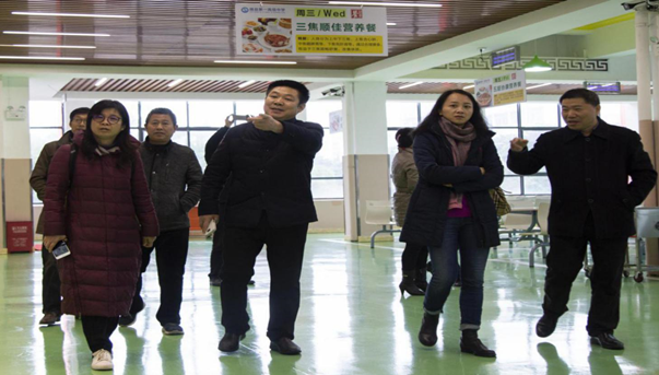 圖二:前排左二為李庭華在向省衛(wèi)健委、營(yíng)養(yǎng)學(xué)會(huì)、縣教育部門(mén)領(lǐng)導(dǎo)介紹食堂。