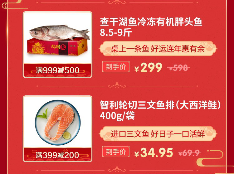 有了雞鴨,自然不能忘記寓意“年年有余”的魚(yú),查干湖冷凍有機(jī)胖頭魚(yú),8.5-9斤左右禮盒裝,京東價(jià)要598元,年貨節(jié)到手價(jià)僅需299,半價(jià)的超值優(yōu)惠讓你節(jié)慶有余!想讓家人嘗點(diǎn)不一樣的“海的味道”,智利輪切三文魚(yú)排(大西洋鮭)可以安排上了,400g一袋裝,到手價(jià)只要34.95元,而且滿(mǎn)399減200,來(lái)年好日子一口鮮活!