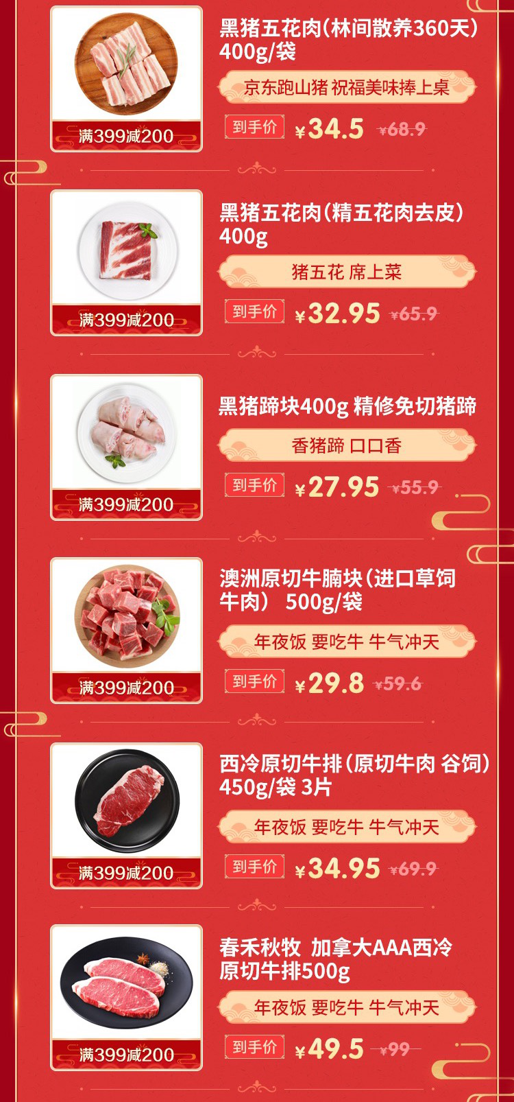 這一次京東年貨節(jié)更是準(zhǔn)備了誠(chéng)意十足的豬肉、牛肉、羊肉等超值年貨,滿(mǎn)399減200,現(xiàn)在不買(mǎi)絕對(duì)會(huì)虧!比如京東林間散養(yǎng)360天的黑豬五花肉,肉質(zhì)緊實(shí),400g袋裝,京東價(jià)要68.9元,年貨節(jié)到手價(jià)僅需34.5元,而精五花肉去皮之后的黑豬五花肉,同等規(guī)格到手價(jià)僅32.95元,春節(jié)家宴上來(lái)一盤(pán)外焦里嫩回味無(wú)窮的紅燒五花肉,想想就流口水啦!還有精修免切的黑豬豬蹄400g袋裝,到手價(jià)27.95元,女孩子想要的膠原蛋白一碗補(bǔ)齊!