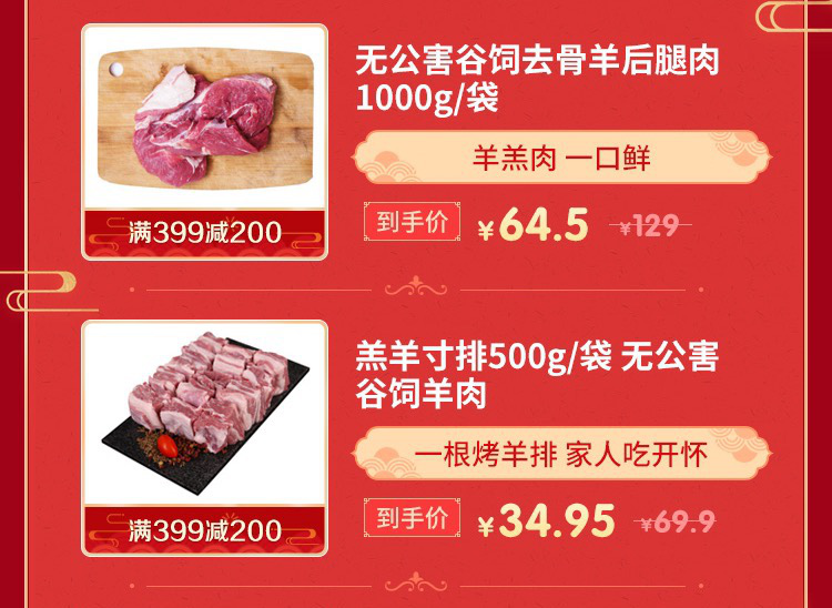 此外,京東年貨節(jié)小年會(huì)場(chǎng),京東價(jià)129元的無(wú)公害谷飼去骨羊后腿肉1000g袋裝,到手直接打半價(jià),只要64.5元,還有無(wú)公害谷飼羊肉羔羊寸排500g袋裝,到手更只要34.95元,羊排、羊腿一斤不到40,吃貨們確定不pick?