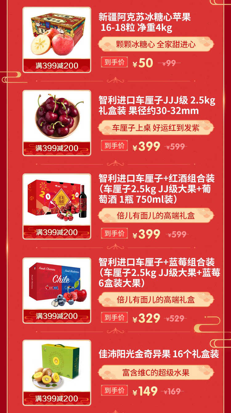 海鮮禮盒之外,水果禮盒也是過(guò)年走親戚必備,智利進(jìn)口車(chē)?yán)遄覬JJ級(jí)2.5kg禮盒裝,到手價(jià)只要399元,更有2.5kg禮盒裝的智利進(jìn)口車(chē)?yán)遄覬J級(jí)大果與750ml品質(zhì)葡萄酒組成大紅大紫年味兒CP,同樣399元到手,新的一年,紅到發(fā)紫了!送禮更要送健康,享譽(yù)全國(guó)的佳沛陽(yáng)光金奇異果16個(gè)禮盒裝,京東年貨節(jié)到手價(jià)僅149元,新的一年,繼續(xù)補(bǔ)充維C!