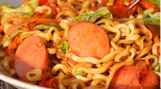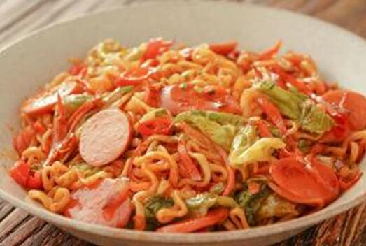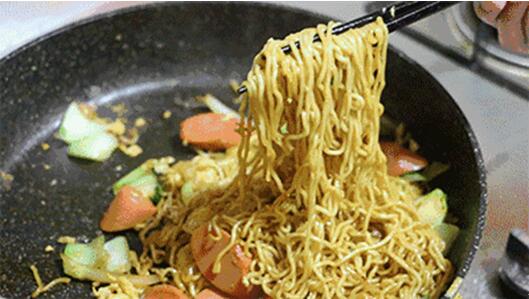 熱鍋冷油,中火燒熱后,放入煮熟的泡面,加入料包及切好的火腿腸片、蔬菜、胡蘿卜等翻炒均勻