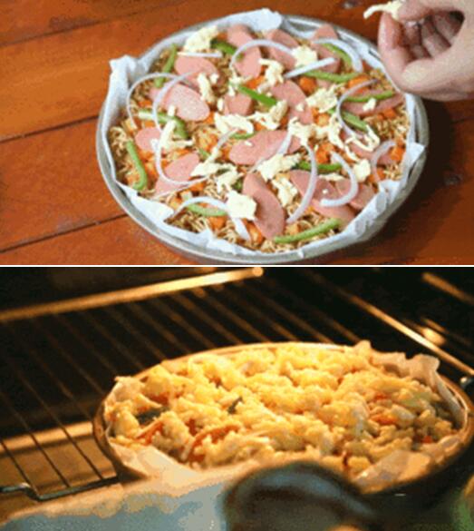 放入烤箱,15分鐘泡面披薩新鮮出爐。