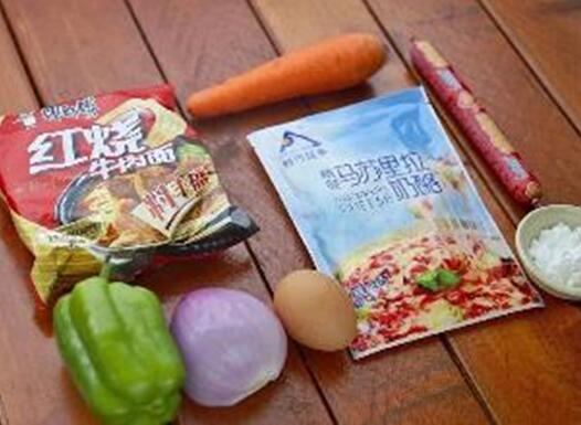 原料簡(jiǎn)單到難以相信,一包紅燒牛肉面泡面,一包奶酪,香腸和雞蛋,全部搞定。