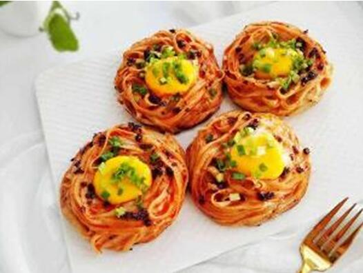 鍋里刷油,將面擺成鳥(niǎo)巢形狀放上蛋黃,兩面煎至金黃后刷上醬汁即可。