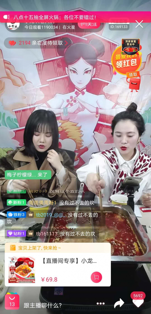 從2018年到2019年,小龍坎火鍋一步步摸索,總結(jié)出了一套自己的直播模式,除了推銷產(chǎn)品之外,為增加粉絲粘性,更注重直播間的氛圍營(yíng)造,比如圣誕節(jié)化小鹿妝,情人節(jié)主播會(huì)唱首歌,跟粉絲多一些變化和互動(dòng)等。尤其在疫情期間,面臨無(wú)法正常復(fù)工,小龍坎火鍋的店鋪主播采取居家直播的方式,直播形式更加隨意自由化,推銷力度變小,直播會(huì)成為一個(gè)大型嘮嗑現(xiàn)場(chǎng),主播也會(huì)變身廚娘,教大家做一些簡(jiǎn)單菜品。相比以往每日10個(gè)小時(shí)的直播時(shí)長(zhǎng),目前小龍坎火鍋每日正常直播控制在2-4個(gè)小時(shí),但帶貨量已達(dá)到以往正常10小時(shí)時(shí)長(zhǎng)所帶來(lái)的交易額。