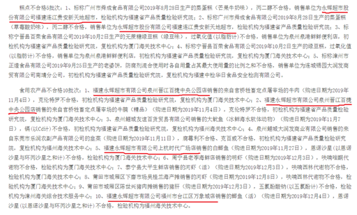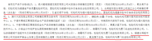 另外,在食用農(nóng)產(chǎn)品不合格10批次中,福建永輝超市有限公司泉州晉江百捷中央公園店銷售的來自官橋牲畜定點屠宰場的牛肉(購進日期為2019年11月4日)和牛腩(精品)(購進日期為2019年11月4日),克倫特羅不合格,初檢機構為福建省產(chǎn)品質(zhì)量檢驗研究院,復檢機構為廈門海關技術中心;福建永輝超市有限公司上杭時代廣場店銷售的白鯽魚(購進日期為2019年11月27日),恩諾沙星(以恩諾沙星與環(huán)丙沙星之和計)不合格,檢驗機構為廈門海關技術中心;福建永輝超市有限公司福州市臺江區(qū)萬象城店銷售的鯽魚(活)(購進日期為2019年12月4日),恩諾沙星(以恩諾沙星與環(huán)丙沙星之和計)不合格,檢驗機構為福州海關技術中心。