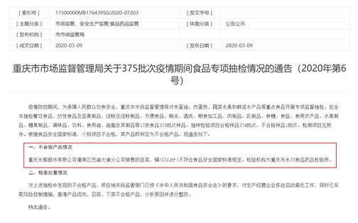 中國經(jīng)濟網(wǎng)北京3月10日訊 3月9日,重慶市市場監(jiān)督管理局發(fā)布關于375批次疫情期間食品專項抽檢情況的通告(2020年第6號)顯示,重慶市市場監(jiān)督管理局對米面油、肉蛋奶、蔬菜水果和鮮活水產(chǎn)品等重點食品開展專項監(jiān)督抽檢。在重慶市抽檢17類食品375批次樣品。抽樣檢驗項目合格樣品374批次,不合格樣品1批次。