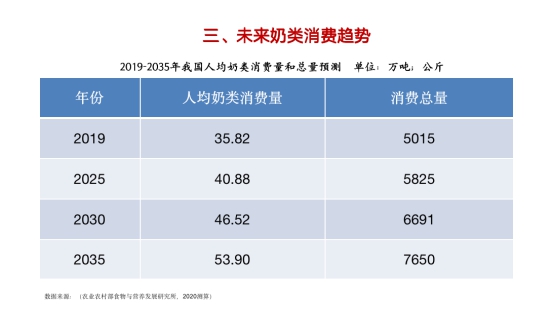 那么未來乳品市場有多大,發(fā)展趨勢如何?對此,農(nóng)業(yè)農(nóng)村部食物與營養(yǎng)發(fā)展研究所動物中心負責人、中國奶業(yè)協(xié)會乳品營養(yǎng)與消費專委會副主任副主任程廣燕提供了中國奶業(yè)協(xié)會營養(yǎng)與消費專業(yè)委員會的研究數(shù)據(jù),提出了未來奶類消費趨勢預測和分析,即到2025年,我國人均奶類消費量可達40.88公斤,消費總量5825萬噸;到2035年,我國人均奶類消費量53.90公斤,消費總量7650萬噸。