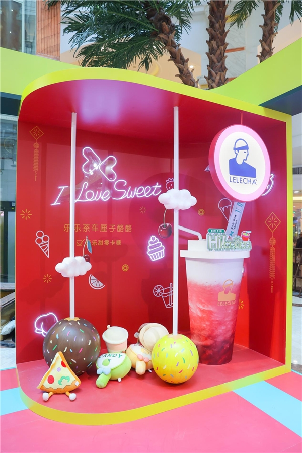 由愛樂甜聯(lián)合樂樂茶,打造的“零糖甜蜜”茶吧,是繼樂樂茶零卡糖版本的奶茶、愛樂甜X樂樂茶聯(lián)名大禮盒之后另一個(gè)零糖空間,中央放置的是巨型樂樂茶奶茶杯,打卡拍照兩相宜。
