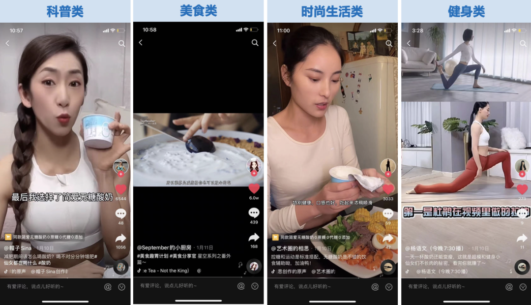 以核心TA高知女性的生活場景為主,放大產(chǎn)品亮點的健身為輔,再配合容易出圈的科普測評類和劇情類場景,高效的kol內(nèi)容矩陣,深度種草簡愛0蔗糖酸奶。好吃又不胖的“無糖甜品”、健身控糖必備的營養(yǎng)補給、工作之余犒勞自己的健康優(yōu)質(zhì)酸奶——簡愛0糖酸奶,正在風靡抖音高知女性群體。