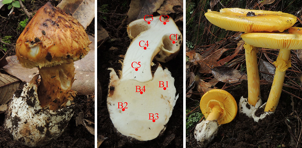 圖1 寄主美麗菌癭傘(Squamanita mira)及其宿主黃蠟鵝膏(Amanita kitamagotake)。左圖示上部的寄主和基部的宿主,中圖示寄主(標(biāo)記為C)和宿主(標(biāo)記為B)及“嫁接痕”,右圖示健康宿主。