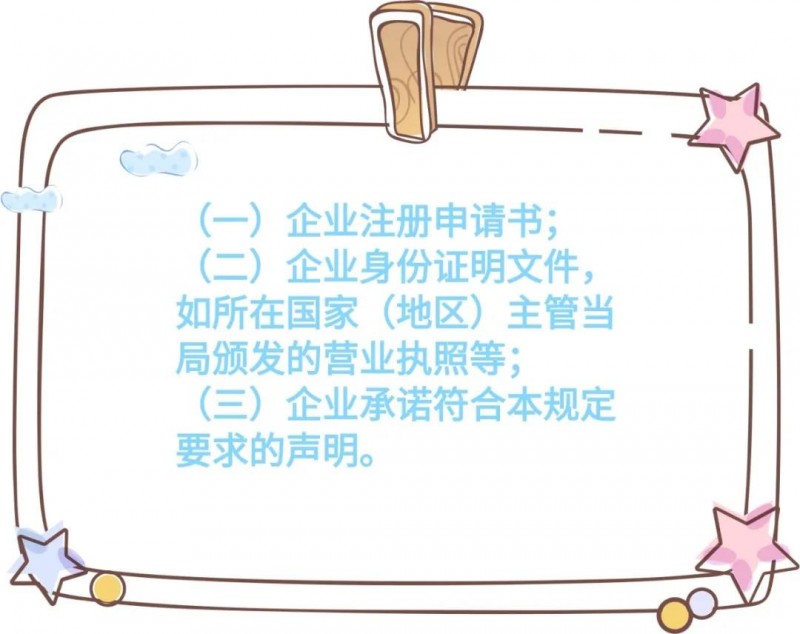 企業(yè)注冊(cè)申請(qǐng)書(shū)內(nèi)容應(yīng)當(dāng)包括企業(yè)名稱、所在國(guó)家(地區(qū))、生產(chǎn)場(chǎng)所地址、法定代表人、聯(lián)系人、聯(lián)系方式、所在國(guó)家(地區(qū))主管當(dāng)局批準(zhǔn)的注冊(cè)編號(hào)、申請(qǐng)注冊(cè)食品種類、生產(chǎn)類型、生產(chǎn)能力等信息。