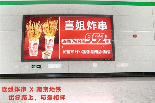 5月,喜姐炸串登陸南京地鐵多條線路,覆蓋雞鳴寺、夫子廟、龍華路、誠(chéng)信大道、翠屏山、綠博園、浦口萬(wàn)匯城……等多個(gè)沿線站點(diǎn)。