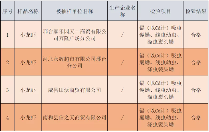 市市場監(jiān)管局對家樂園超市萬隆廣場店、永輝超市、威縣田沃商貿(mào)公司、南和信之天商貿(mào)公司經(jīng)營的小龍蝦進行了隨機抽檢,檢驗項目為鎘(以Cd計)、吸蟲囊蚴、線蟲幼蟲、滌蟲裂頭蚴,共抽檢4個批次,全部合格。