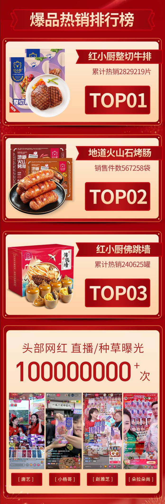 據(jù)了解,紅小廚在2022年貨季期間完美收官、戰(zhàn)果斐然,這也從一方面佐證了預(yù)制菜的火爆。在年貨季期間:紅小廚銷售額全平臺同比增長362%,下單數(shù)量同比增長286%,多次霸榜平臺類目top榜單,累計登上100萬+家庭餐桌,其中紅小廚牛排、地道火山石烤腸、佛跳墻等爆品登上各平臺銷售TOP榜。
