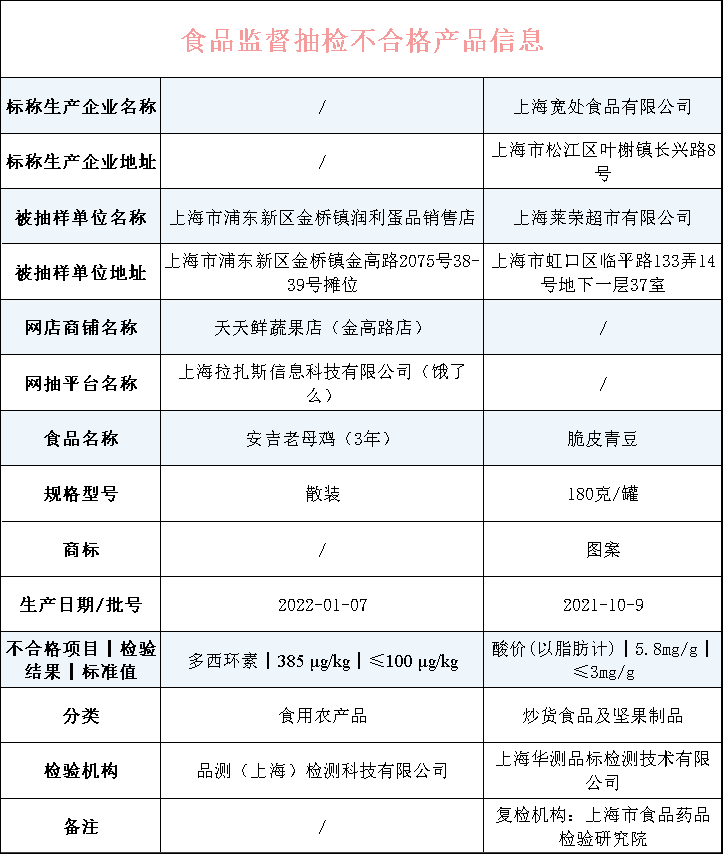2.上海寬處食品有限公司生產(chǎn)、上海萊榮超市有限公司銷售的脆皮青豆[不合格項(xiàng)目:酸價(jià)(以脂肪計(jì))]。