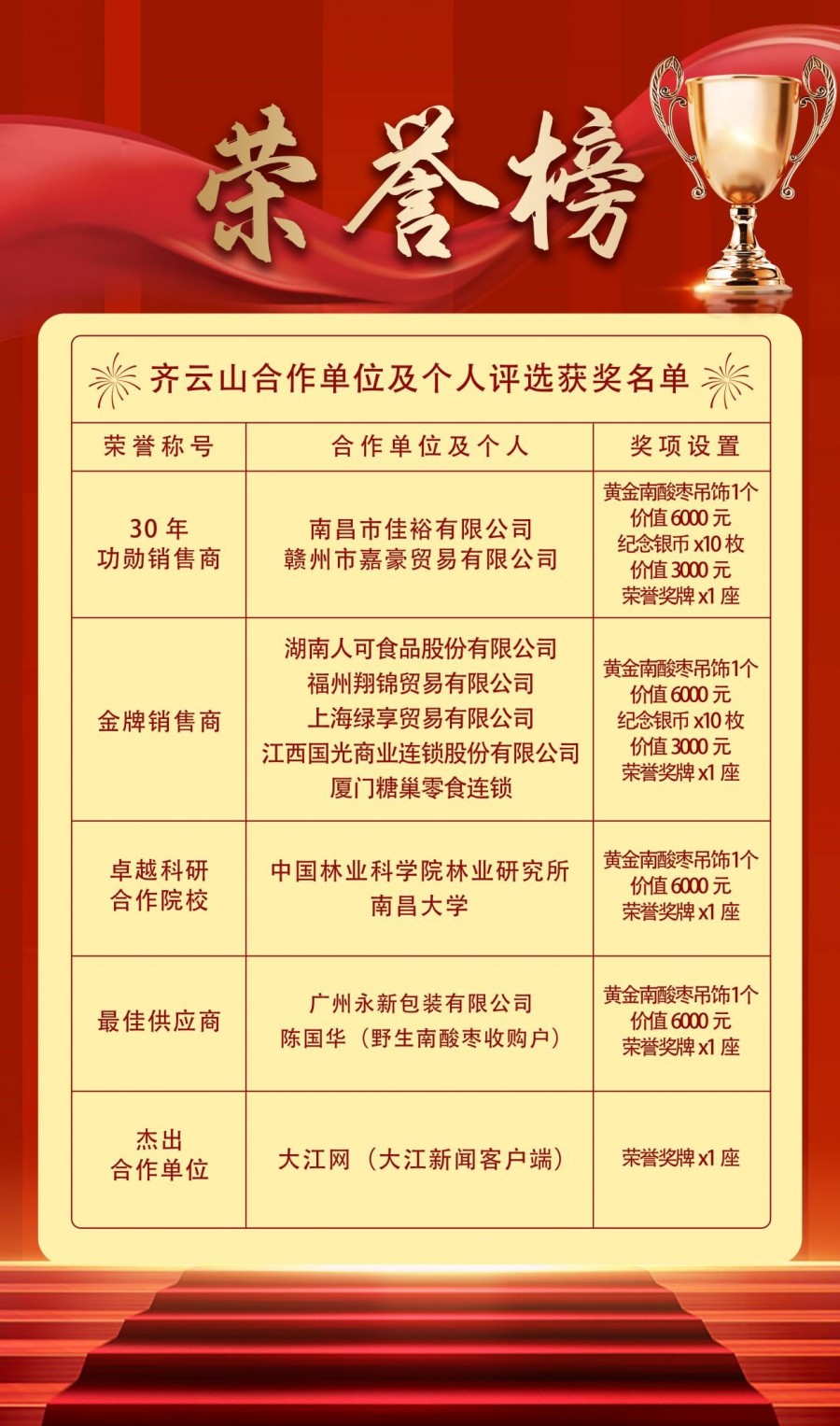 以上獲獎(jiǎng)合作單位和個(gè)人將受邀參加10月29日在“中國(guó)南酸棗之鄉(xiāng)”——崇義舉行的“齊云山南酸棗糕上市30周年&綠色食品認(rèn)證25周年晚會(huì)”并頒發(fā)榮譽(yù)獎(jiǎng)牌和獎(jiǎng)品。