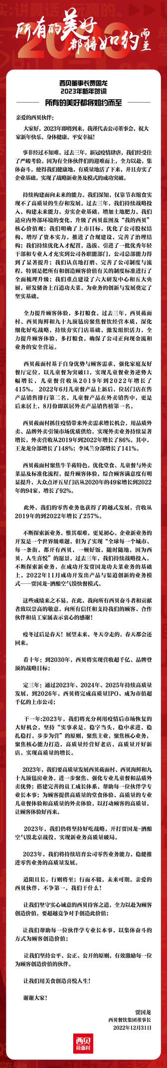 以下為西貝董事長賈國龍內(nèi)部信《2023年新年賀詞:所有的美好都將如約而至》全文: