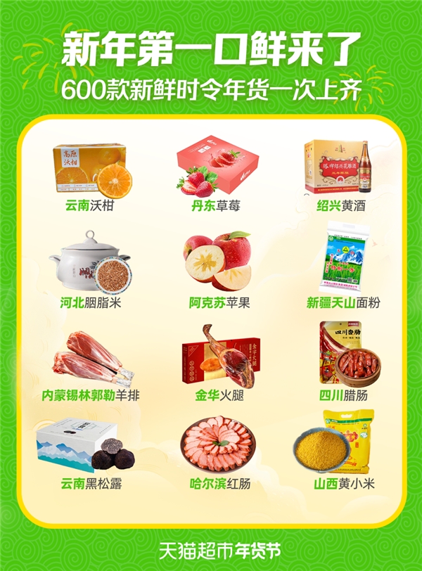 另外,還有60萬顆云南高原沃柑、40000斤內(nèi)蒙錫林郭勒草地羊羊排、精選海拔3500米的云南特級鮮松露趕集天貓超市年貨節(jié)。同時(shí),這些新鮮時(shí)令年貨會在1月5日19點(diǎn)天貓超市直播間“特色尋味團(tuán)”中亮相。