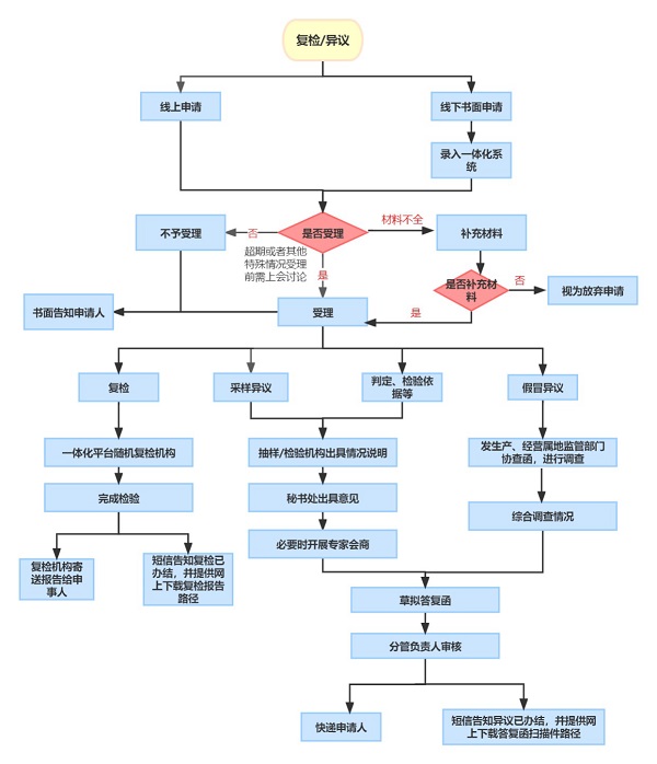 對樣品真實性、檢驗方法、標(biāo)準(zhǔn)適用等事項有異議的,申請人應(yīng)當(dāng)自收到不合格結(jié)論通知之日起7個工作日內(nèi),向組織實施監(jiān)督抽檢的市場監(jiān)督管理部門提出書面申請并提交相關(guān)證明材料,或在規(guī)定時限內(nèi)通過“浙江政務(wù)服務(wù)網(wǎng)”、“浙里辦”APP等互聯(lián)網(wǎng)平臺線上申請。