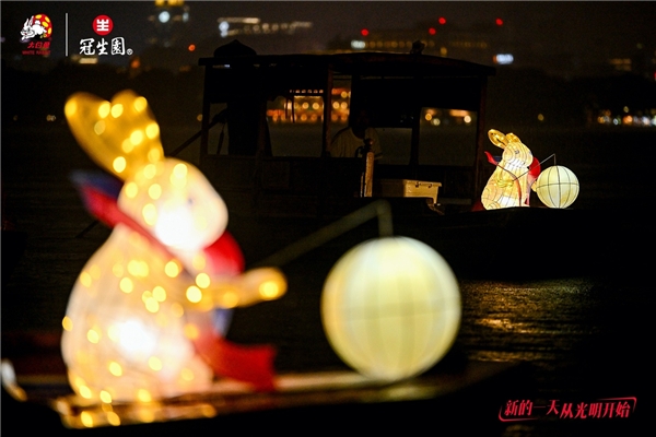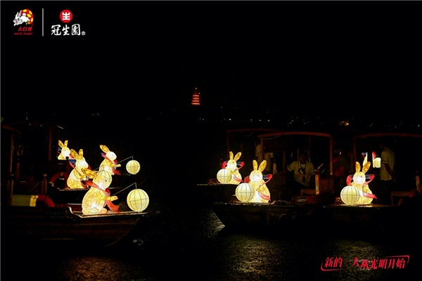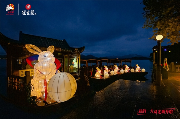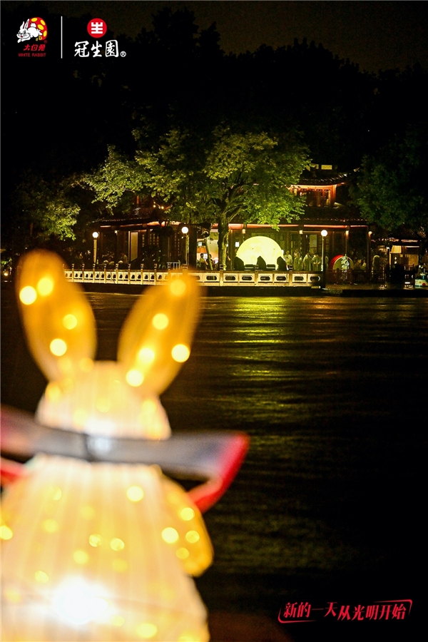 夜晚,西湖鼓聲隆隆,多個(gè)大白兔的燈彩在溶溶月色下透著星光。此刻,我們共同點(diǎn)亮中秋團(tuán)圓的快樂時(shí)光,共同許下但愿樂長(zhǎng)久的美好祝愿,今秋,就和大白兔一起,分享月餅、共賞明月,快樂共此時(shí)!