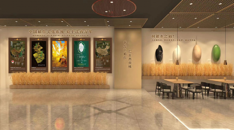 踏入餐廳的那一刻,仿佛穿越了時空隧道,來到了那片孕育了華夏文明的 古老稻田??諝庵袕浡牡鞠?, 與山水江西的古樸裝飾相得益彰,每一處細(xì)節(jié)都透露著對自然的敬畏與依戀。墻上掛著的,不僅有一萬年前的水稻化石及培育的演變史,也有世界罕見的1.8米高的萬年貢米稻穗的標(biāo)本,從一萬年以前的陶罐上水稻的壓痕到桌上香噴噴的萬年貢米飯,從桌上用的紙巾到外賣打包盒的包裝上,以24節(jié)氣命名的包廂里等,每個角落都有稻作文化知識,讓它們靜靜地訴說著遠(yuǎn)古人類通過稻作與土地的不解之緣。