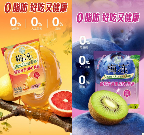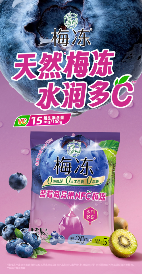 蜂蜜柚子NFC梅凍與藍(lán)莓奇異果NFC梅凍延續(xù)了溜溜梅梅凍的健康理念,真正做到了“0防腐劑、0人工色素、0脂肪”,且均富含天然VC,維生素含量15mg/100g,日常食用可幫助補(bǔ)充身體所需維生素,為健康生活增添一份天然助力,無論是秋冬清潤、飯后解膩、歡聚分享還是日常解饞,都是便捷又健康的選擇。