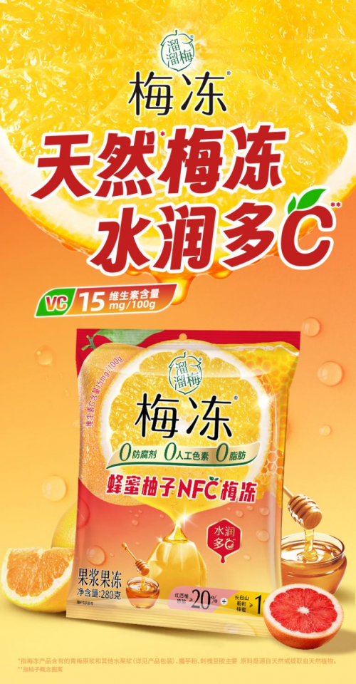 作為溜溜梅梅凍的誠意新品,蜂蜜柚子NFC梅凍特別采用NFC鮮果生榨工藝,產(chǎn)品紅西柚原漿≥20%、長白山椴樹蜂蜜≥1%,能緩解口干舌燥,帶來溫潤爽口的味覺體驗(yàn),為您的假日休閑時(shí)光,增添一份恰到好處的清新美味。