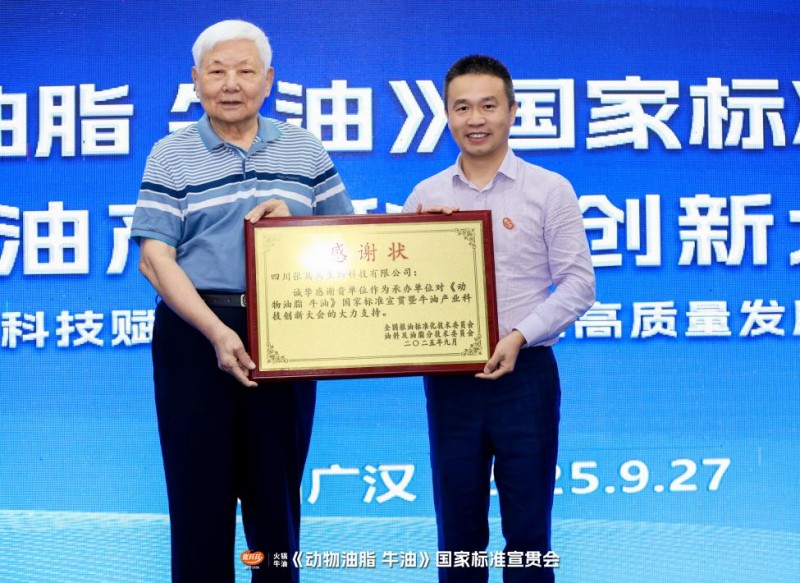 2025年9月27日,由全國(guó)糧油標(biāo)準(zhǔn)化技術(shù)委員會(huì)油料及油脂分技術(shù)委員會(huì)主辦、四川張兵兵生物科技股份有限公司核心承辦的《動(dòng)物油脂 牛油》國(guó)家標(biāo)準(zhǔn)宣貫暨牛油產(chǎn)業(yè)科技創(chuàng)新大會(huì)”在中國(guó)火鍋食材之都——廣漢隆重召開(kāi)。全國(guó)糧油標(biāo)準(zhǔn)化技術(shù)委員會(huì)眾多專家、廣漢市委常委及相關(guān)部門(mén)領(lǐng)導(dǎo)、油脂領(lǐng)域教授專家、行業(yè)協(xié)會(huì)及媒體、牛油產(chǎn)業(yè)鏈上下游企業(yè)等代表,約120人參加了本次會(huì)議,共同見(jiàn)證牛油產(chǎn)業(yè)從“無(wú)序”邁入“有序”的里程碑時(shí)刻!