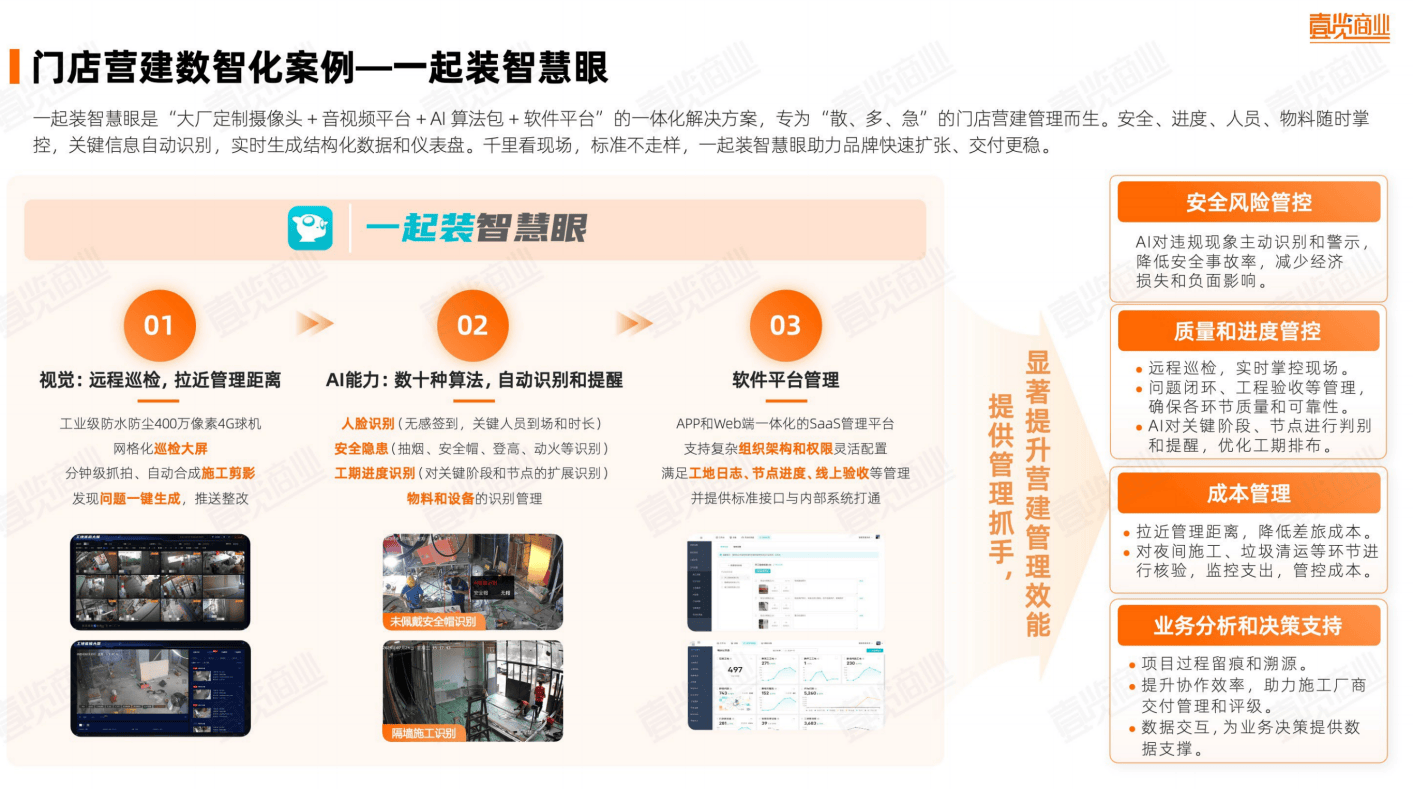 這一體系讓品牌實(shí)現(xiàn)了從“人盯現(xiàn)場”到“AI盯工地”的跨越:AI可通過算法完成自動巡檢、階段對比和節(jié)點(diǎn)驗(yàn)收,幫助品牌實(shí)現(xiàn)項(xiàng)目管理的可量化、可追蹤,顯著提升門店擴(kuò)張效率。