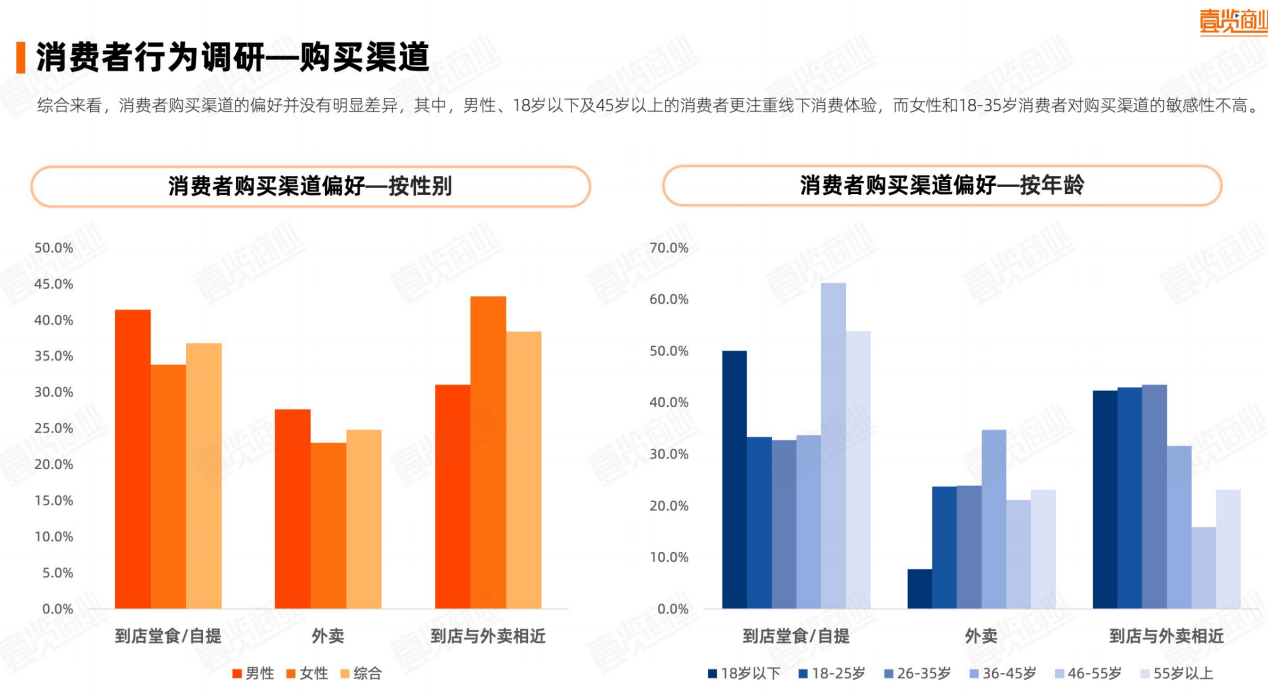 在消費(fèi)場景上,線下體驗(yàn)仍是主戰(zhàn)場。數(shù)據(jù)顯示,無論性別或年齡差異,到店自提與堂食依舊是最主流的購買方式,其中男性與18歲以下、45歲以上人群對線下場景依賴更高;而18—35歲的年輕女性則表現(xiàn)出更強(qiáng)的渠道包容性,線上點(diǎn)單、線下自提已成為她們的日常習(xí)慣。
