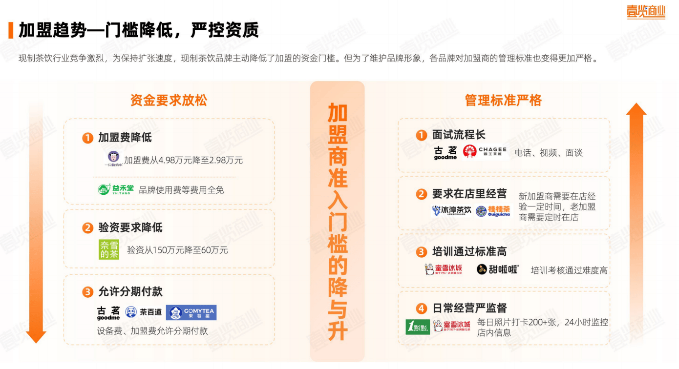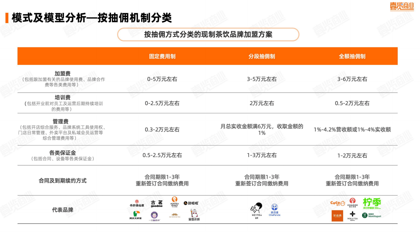 從商業(yè)模式看,現(xiàn)制茶飲行業(yè)目前以加盟模式為主,部分品牌直營和加盟模式并行,中小品牌一般先以直營完成商業(yè)模式驗(yàn)證后開啟擴(kuò)張。而在加盟模式中,按抽傭機(jī)制可以分成固定費(fèi)用制、分段抽傭制和全額抽傭制三類。