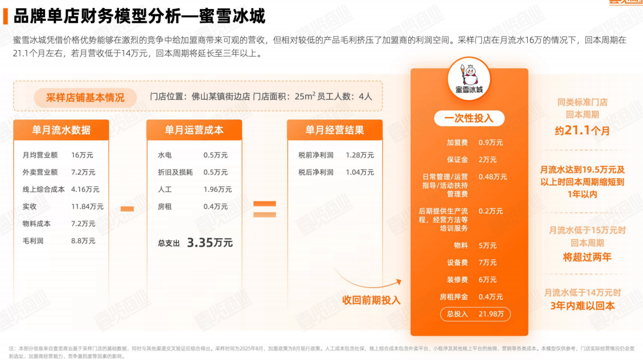 而蜜雪冰城,憑借價(jià)格優(yōu)勢能夠在激烈的競爭中給加盟商帶來可觀的營收,但相對較低的產(chǎn)品毛利擠壓了加盟商的利潤空間。采樣門店在月流水16萬的情況下,回本周期在21.1個(gè)月左右,若月營收低于14萬元,回本周期將延長至三年以上。