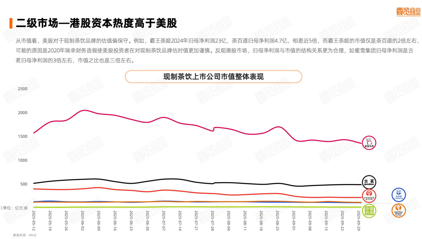 港股成為現(xiàn)制茶飲品牌上市的主要陣地,資本關(guān)注度明顯高于美股。無論是從市值體量還是盈利結(jié)構(gòu)來看,蜜雪冰城已獨(dú)立成檔,其市值和營收均遠(yuǎn)超其他品牌;古茗與霸王茶姬形成第二梯隊(duì),具備穩(wěn)定增長與盈利能力;茶百道、滬上阿姨、奈雪的茶則位于第三梯隊(duì),市值分化明顯。