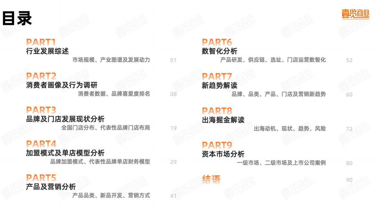 《報(bào)告》總體分為八個(gè)部分,分別從行業(yè)、消費(fèi)者、品牌及門店、加盟、產(chǎn)品、營銷、數(shù)字化、資本市場及2025新趨勢等10個(gè)方向全面解讀2025現(xiàn)制茶飲行業(yè)。