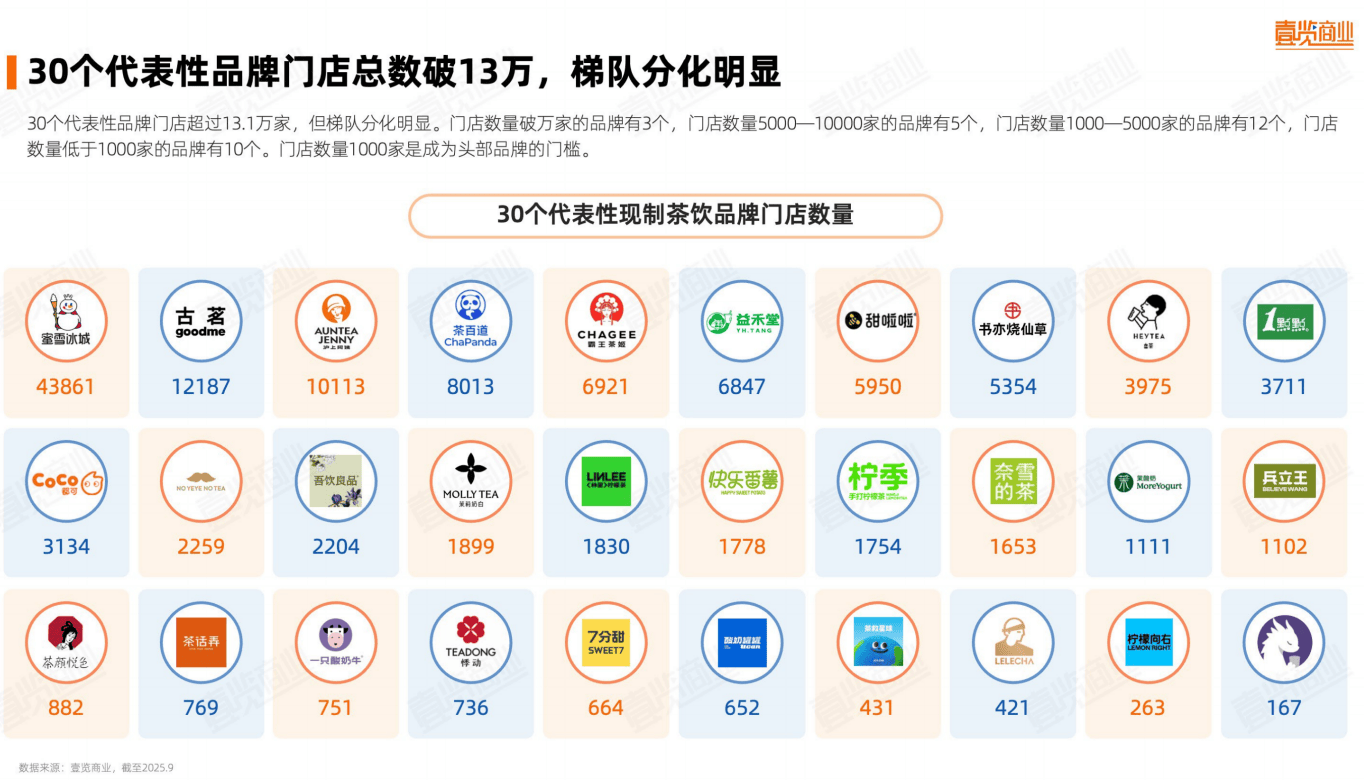 《報(bào)告》顯示,截至2025年9月,全國30個(gè)代表性現(xiàn)制茶飲品牌門店總量已突破13.1萬家,行業(yè)分化趨勢愈發(fā)明顯。頭部品牌“巨無霸”效應(yīng)顯著,蜜雪冰城以4.38萬家門店穩(wěn)居首位,規(guī)模接近第二名古茗(1.2萬家)的四倍。