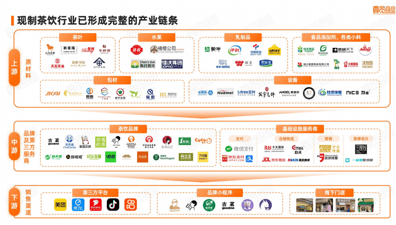 這一變化背后,是茶飲產(chǎn)業(yè)鏈的成熟與競爭格局的固化。上游從原料到設(shè)備形成了完整生態(tài):茶葉、水果、乳制品、包材、添加劑等環(huán)節(jié)均已高度專業(yè)化,涌現(xiàn)出天圣有機(jī)、佳農(nóng)、伊利、安琪酵母等穩(wěn)定供應(yīng)商體系;中游則由品牌及第三方服務(wù)商構(gòu)成核心增長引擎,品牌矩陣基本成型;下游渠道以美團(tuán)、餓了么、小紅書、抖音等多元平臺為主,線上化、數(shù)字化程度快速提升。