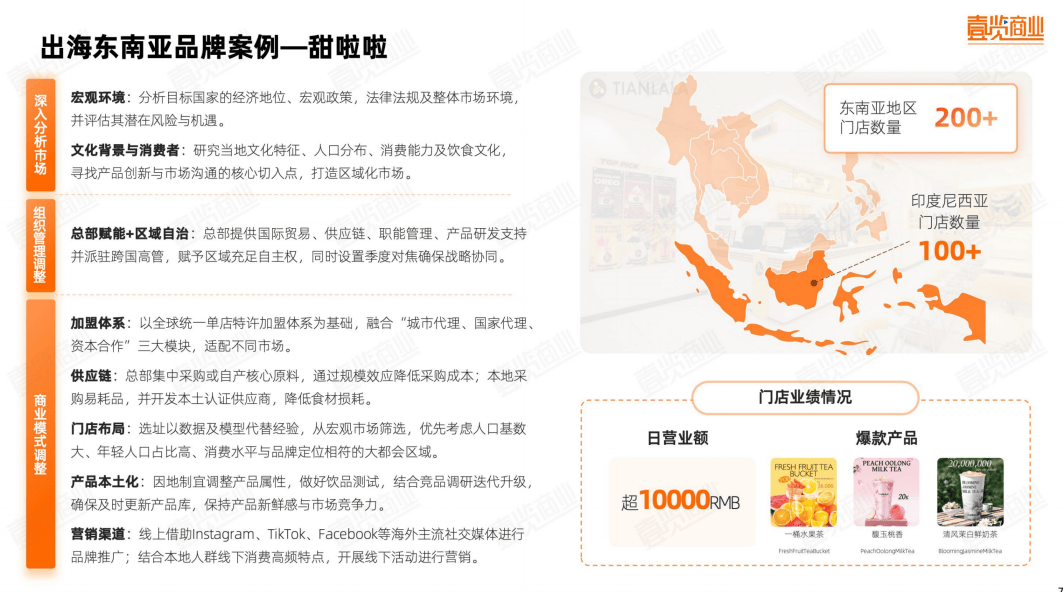 以甜啦啦出海印尼為例,該品牌采用“總部統(tǒng)籌+區(qū)域自營+城市代理”的管理架構(gòu),通過集中采購核心原料、本地采購易消耗品來降低供應(yīng)鏈成本;印尼單國門店突破百家,東南亞區(qū)域總量超過200家,單店日營收超萬元人民幣。
