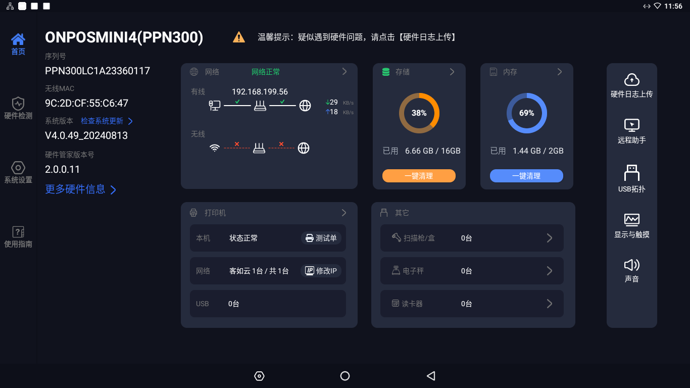 餐飲設(shè)備高強(qiáng)度運轉(zhuǎn)時,運維常因故障難預(yù)判、網(wǎng)絡(luò)難切換、外設(shè)難掌控陷入經(jīng)營被動。POS 5D 搭載專屬硬件管家功能,化身智能中樞為設(shè)備健康全天候主動護(hù)航。它支持雙網(wǎng)共存(WiFi / 有線),可實現(xiàn)智能災(zāi)備:若有線網(wǎng)絡(luò)互聯(lián)網(wǎng)異常,能自動連接其他 WiFi 線路(如手機(jī)熱點)保障聯(lián)網(wǎng),同時保留有線網(wǎng)絡(luò)連接本地設(shè)備,確保網(wǎng)口打印機(jī)等外設(shè)正常使用,有效保障 POS 不掉線;其智能檢測功能能實時掃描設(shè)備及打印機(jī)、掃碼槍等外設(shè)運行狀態(tài),提前預(yù)警故障隱患;控制中心還能清晰呈現(xiàn)設(shè)備及外設(shè)連接狀態(tài),商家無需專業(yè)技術(shù)也能輕松掌握設(shè)備狀態(tài),大幅降低運維成本與運營中斷風(fēng)險。