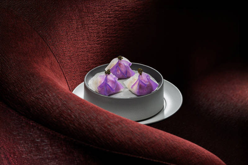 點(diǎn)心精選手拆蟹肉與鮮嫩蝦仁,佐以清脆蘆筍粒和天然蝶豆花汁,交織出豐富多元的口感層次,在味覺與視覺上均呈現(xiàn)出精致的藝術(shù)美感。