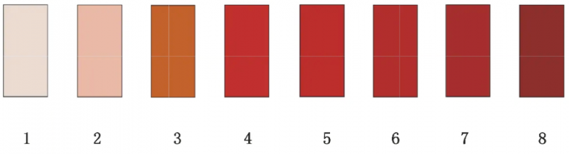 肉色從淺到深分為1級(jí)、2級(jí)、3級(jí)、4級(jí)、5級(jí)、6級(jí)、7級(jí)和8級(jí),其中4級(jí)、5級(jí)的肉色最好。肉色按照標(biāo)準(zhǔn)附錄B中 B.1的方法評(píng)定。